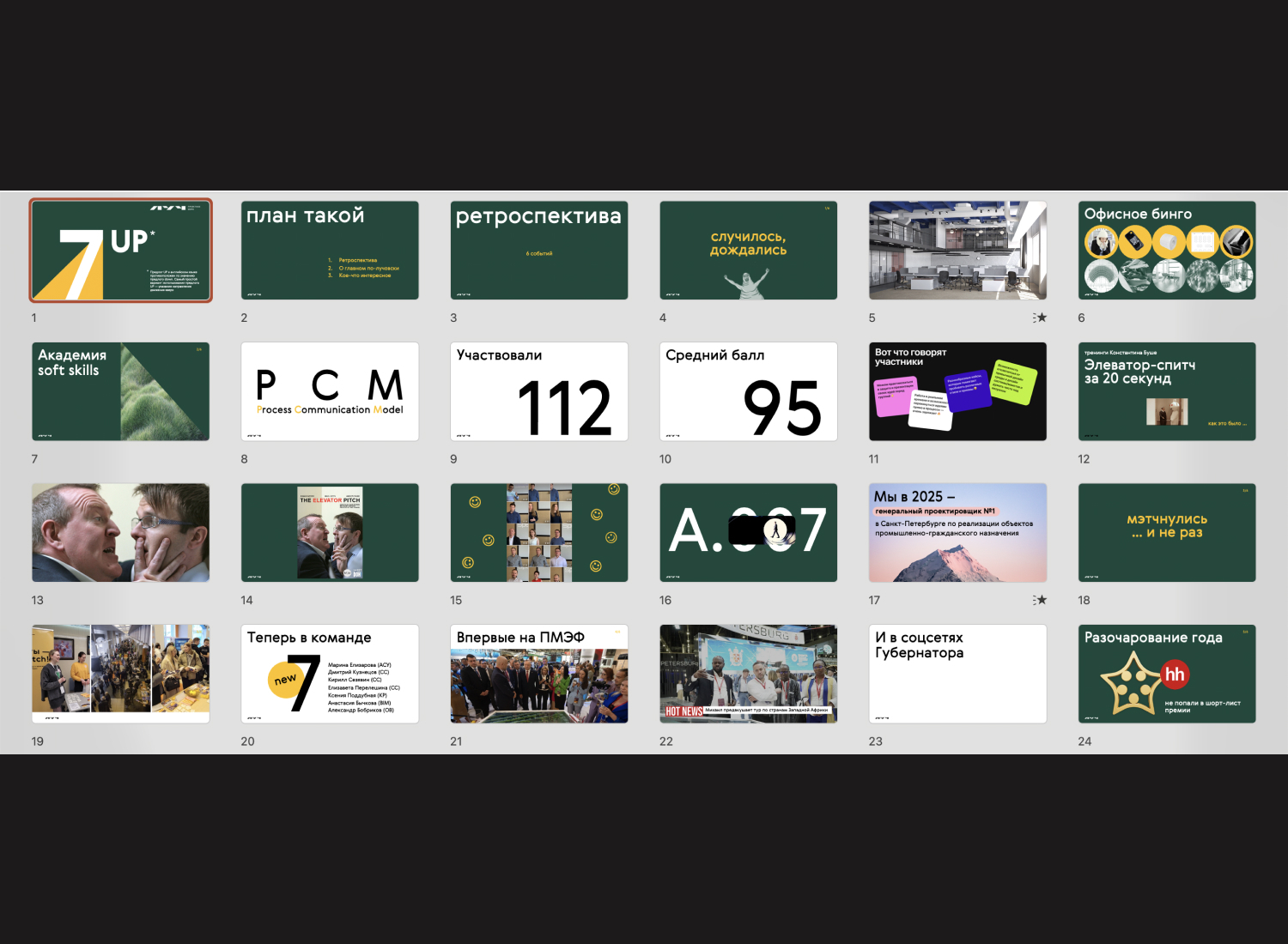 Уже в 4-й раз готовим внутреннюю конференцию для Проектного бюро ЛУЧ. Всегда пытаемся делать все «заранее», но… как всегда в последний момент)))) (тут 100 500 улыбочек). Это внутренний формат: нужно придерживаться TOV бренда, геометричного контрастного фирстиля, и при этом, хочется держать во внимании и видеть горящие глаза. Для этого прорабатываем каждый слайд с точки зрения текстов и приправляем мемасиками, классной графикой. Сложно, но безумно интересно.