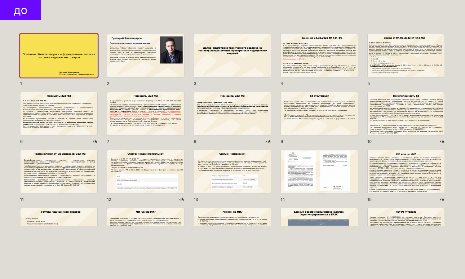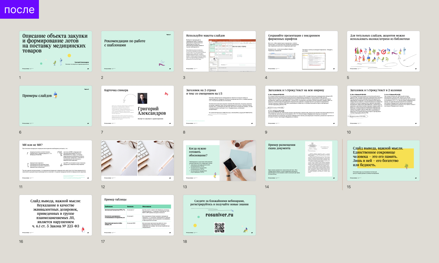 Прохожу что-то испытательного срока в качестве внештатного дизайнера для проекта Торги223. Первое задание: разработать шаблон презентации для вебинаров образовательного портала Росунивер на основе гайда портала. Казалось бы, чего сложного сделать шаблон на основе уже имеющейся айдентики, но! подбор размеров заголовка и текста с учетом количества текста, слайды для выводов, карточка спикера и многое другое. ТЗ было на 5 слайдов, сделала 18 :) По-другому не могу — хочется чтобы заказчик закрывал все свои потребности.